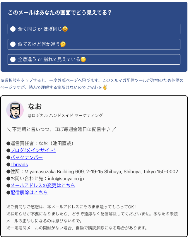 ※選択肢をタップすると、一度外部ページへ飛びます。このメルマガ配信ツールが洋物のため英語のページですが、読んで理解する箇所はないのでご安心を✌️