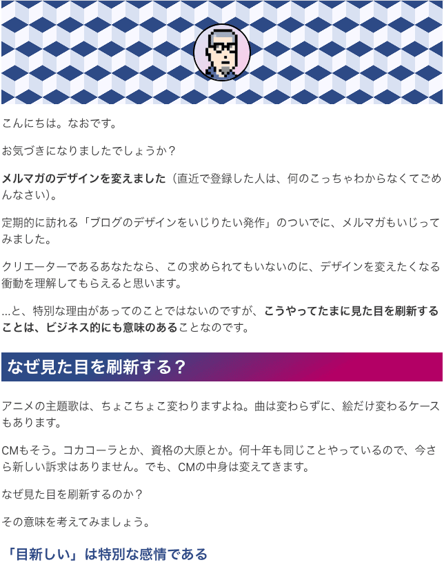 メルマガのデザインを変えました(直近で登録した人は、何のこっちゃわからなくてごめんなさい)。